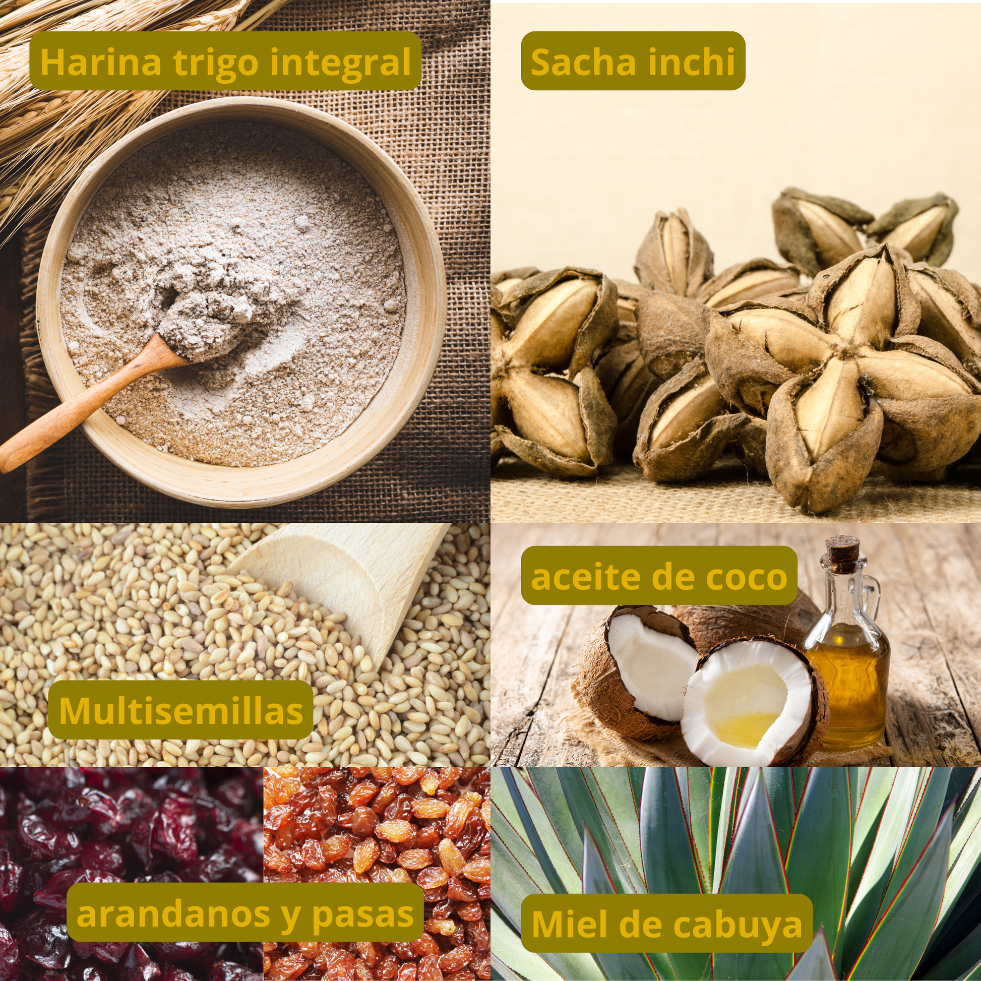 Harina de Trigo, Mezcla de Sacha Inchi (bebida de sacha inchi y semillas de sacha inchi), Arándanos, Pasas, Linaza, Semillas de Girasol, Ajonjolí, Semillas de Calabazas, Salvado de trigo, Aceite de Coco, Levadura fresca, Escencia Especial Natural Paneton, Gluten de Trigo, Mejorador de Masa, Sal de Maras, Miel de Cabuya.